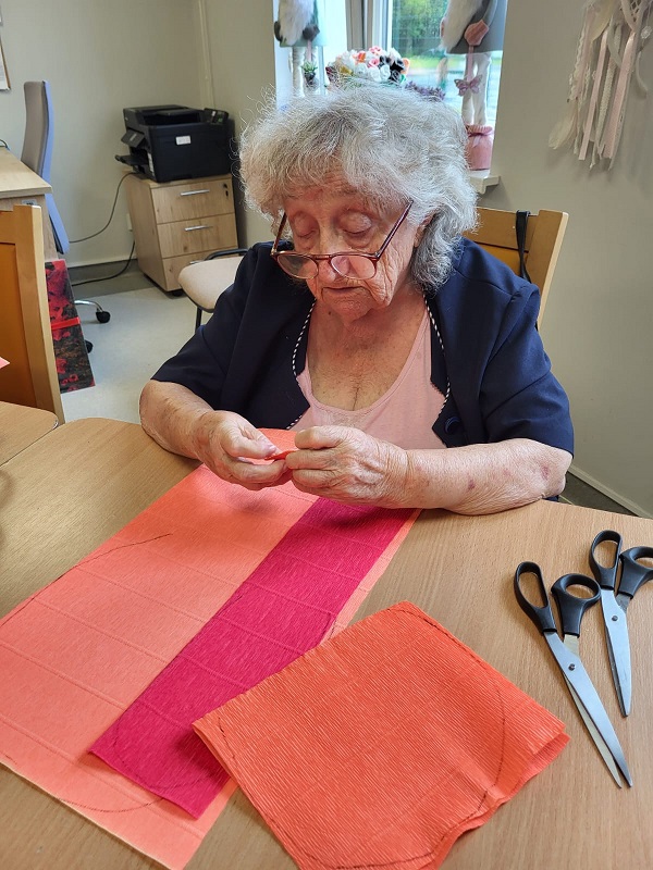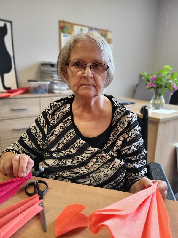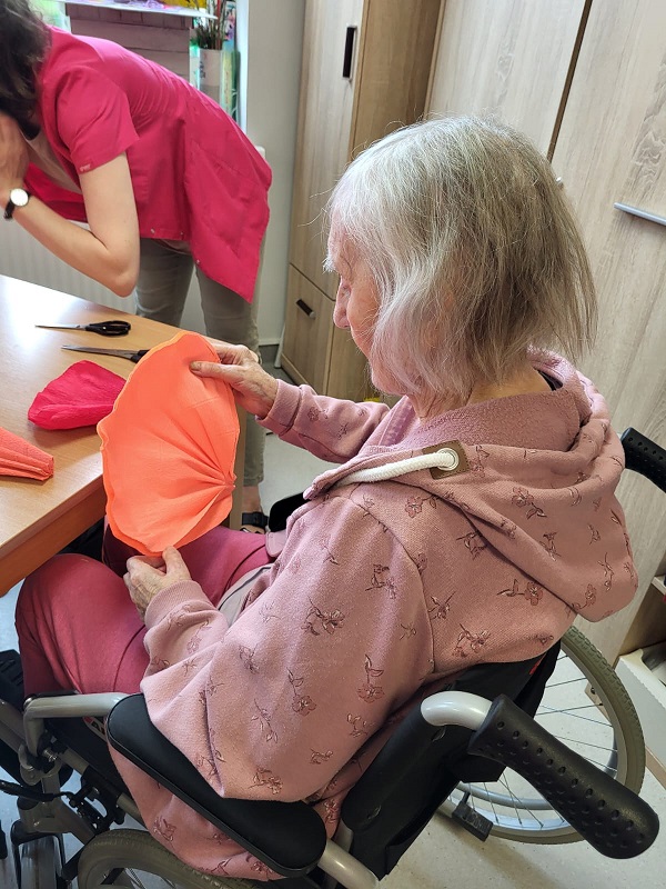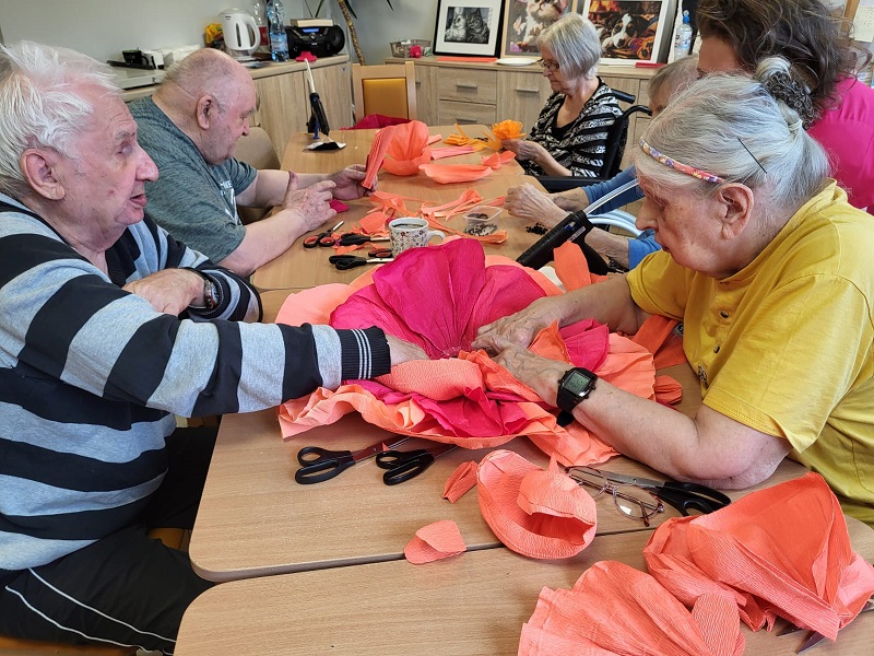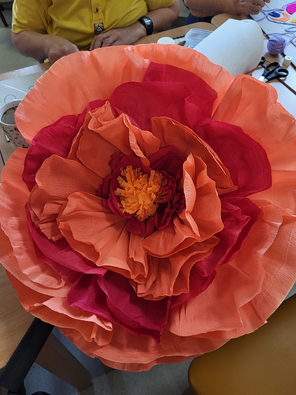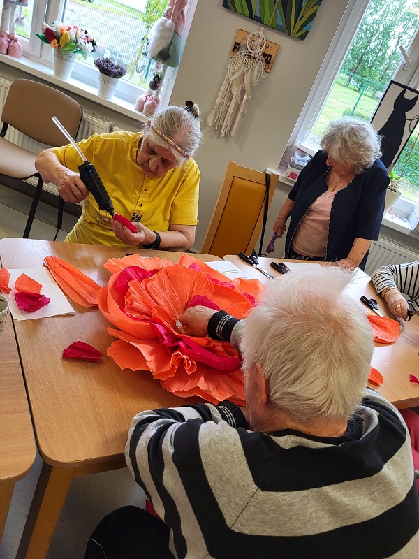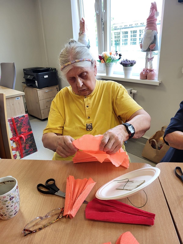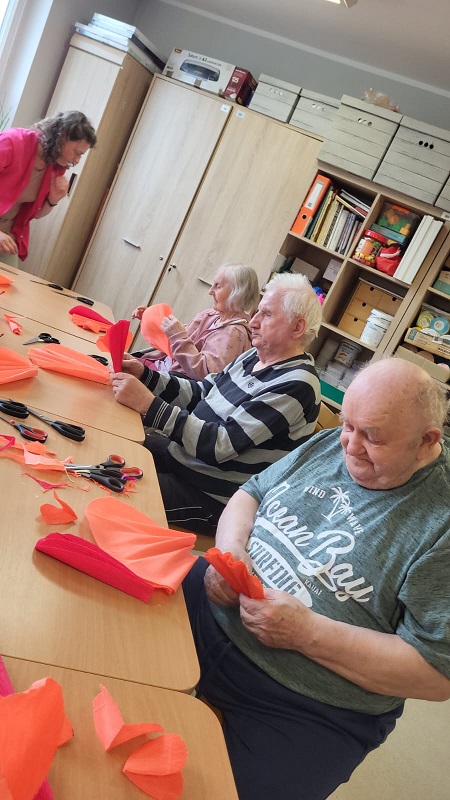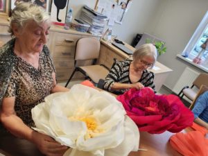 W dniu 22 lipca 2025r seniorzy podczas zajęć arteterapii tworzyli wspólnie dużego, kolorowego kwiatka – piwonię z krepiny. Praca wymagała precyzji, cierpliwości i współpracy, ale efekt przerósł nasze oczekiwania. Powstał piękny, okazały kwiat, który będzie ozdobą naszej sali i dowowem na to, że kreatywność i pasje nie mają wieku!