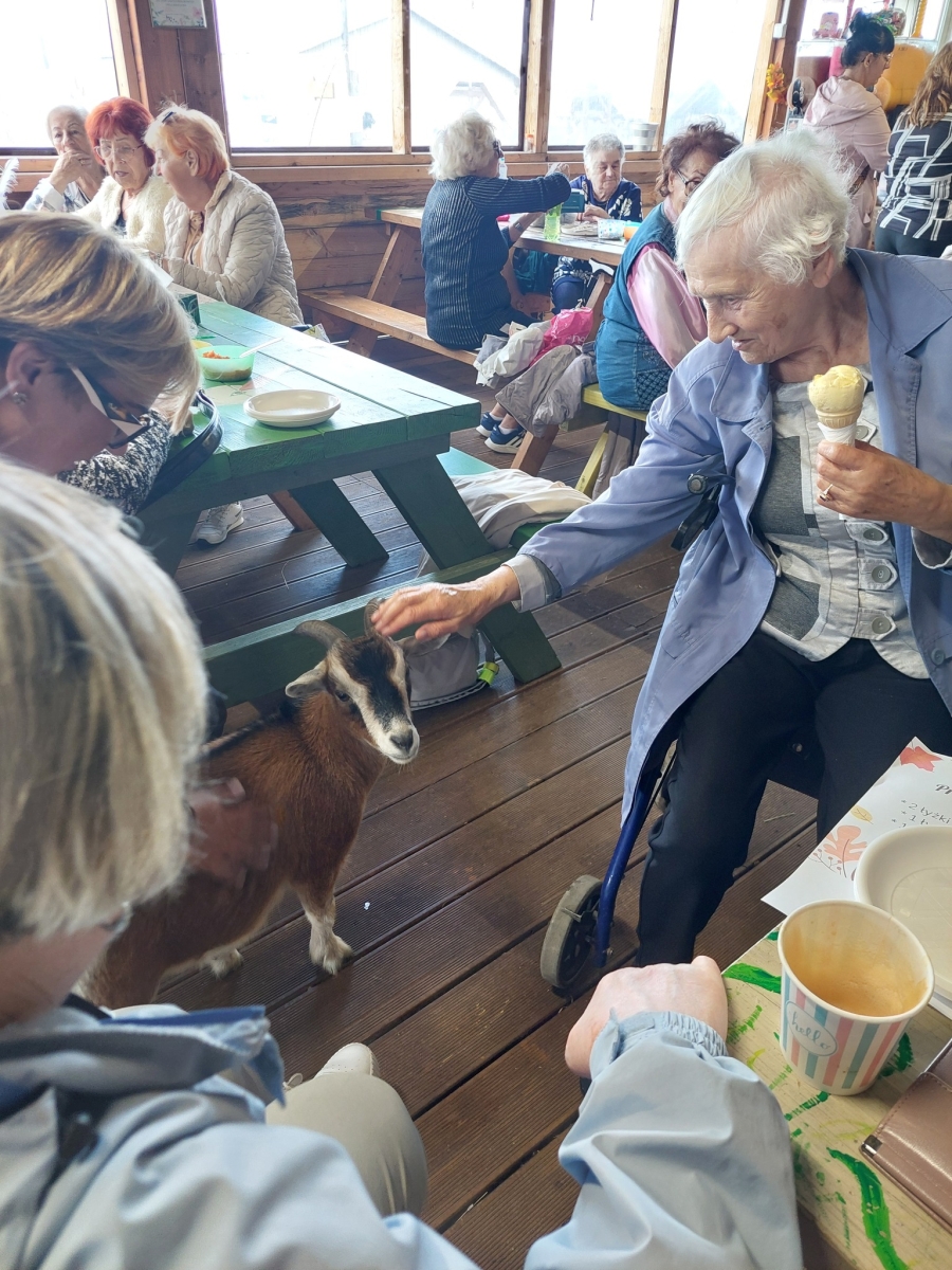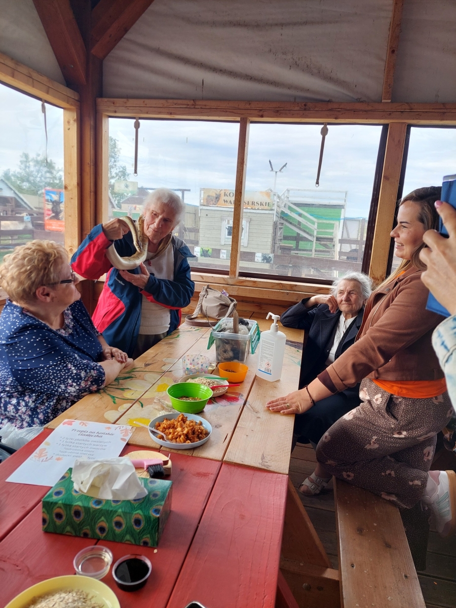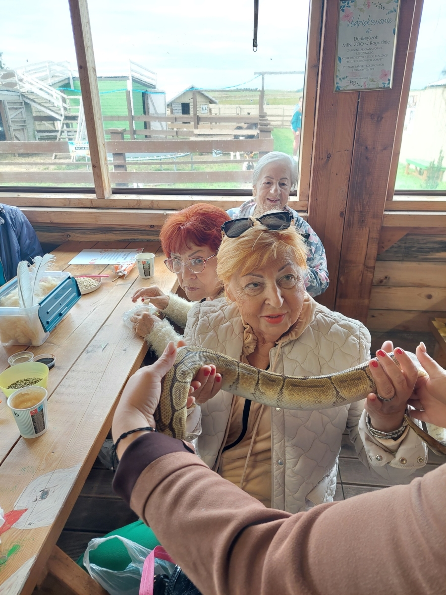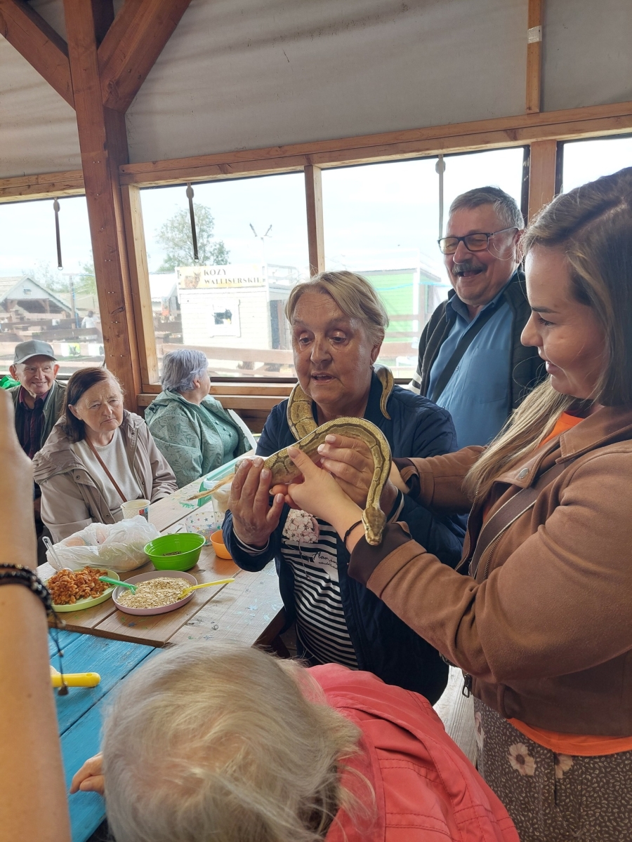„I rozpoczęliśmy!!! W dniu 12.09.2025 r. seniorzy z Dziennego Domu Złoty Wiek „Senior+” oraz Klubu Różany Zakątek „Senior+” odwiedzili mini z o.o. DonkeySzot Rogozina. Wyjazd został zorganizowany w ramach projektu pt. Podniesienie jakości usług świadczonych przez Dom Pomocy Społecznej „Zielony Taras” w Koszalinie współfinansowanego ze środków ze środków Europejskiego Funduszu Społecznego Plus w ramach Programu Fundusze Europejskie Dla Pomorza Zachodniego 2021-2027 – zadanie 1 Organizacja zajęć i warsztatów dla seniorów. Na miejscu czekało na seniorów wiele atrakcji, w tym warsztaty, na których samodzielnie przygotowali ciasteczka dla zwierząt kopytnych i wysłuchali prelekcji na temat opieki nad zwierzętami, przygotowanych przez osoby prowadzące warsztaty. Seniorzy spróbowali odgadnąć, do których ptaków należą zebrane pióra, sprawdzili, jaka jest różnica pomiędzy runem poszczególnych owiec i z zaciekawieniem przyglądali się wylinkom węży. Seniorów w trakcie warsztatów przywitali pierwsi mieszkańcy DonkeySzot: koty, których jest tu trzynaście, wąż, mopsik oraz urocza koza Milenka, która towarzyszyła seniorom także w trakcie spaceru po zoo. Uczestnicy chętnie przebywali w towarzystwie zwierząt, dotykali, głaskali i karmili. Z dużym zainteresowaniem wysłuchali instrukcji prowadzącej, dotyczących postępowania z wężem, a niektórzy z nich nawet odważyli się wziąć tego pięknego gada w ręce. Po warsztatach seniorzy zwiedzili terrarium i zagrody ze zwierzętami, o których prowadząca ciekawie opowiadała i zachęcała seniorów do karmienia, podając przygotowaną mieszankę. Pogoda również dopisała. To była udana terapia zwierzętami.”