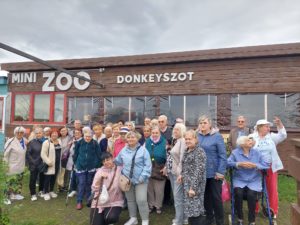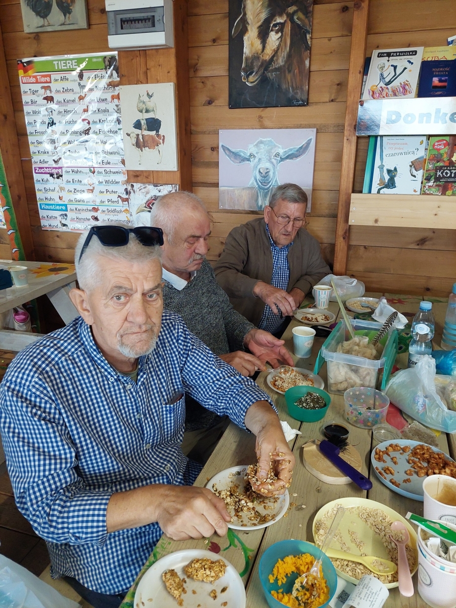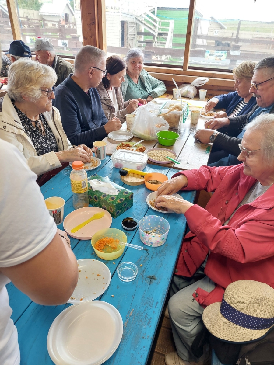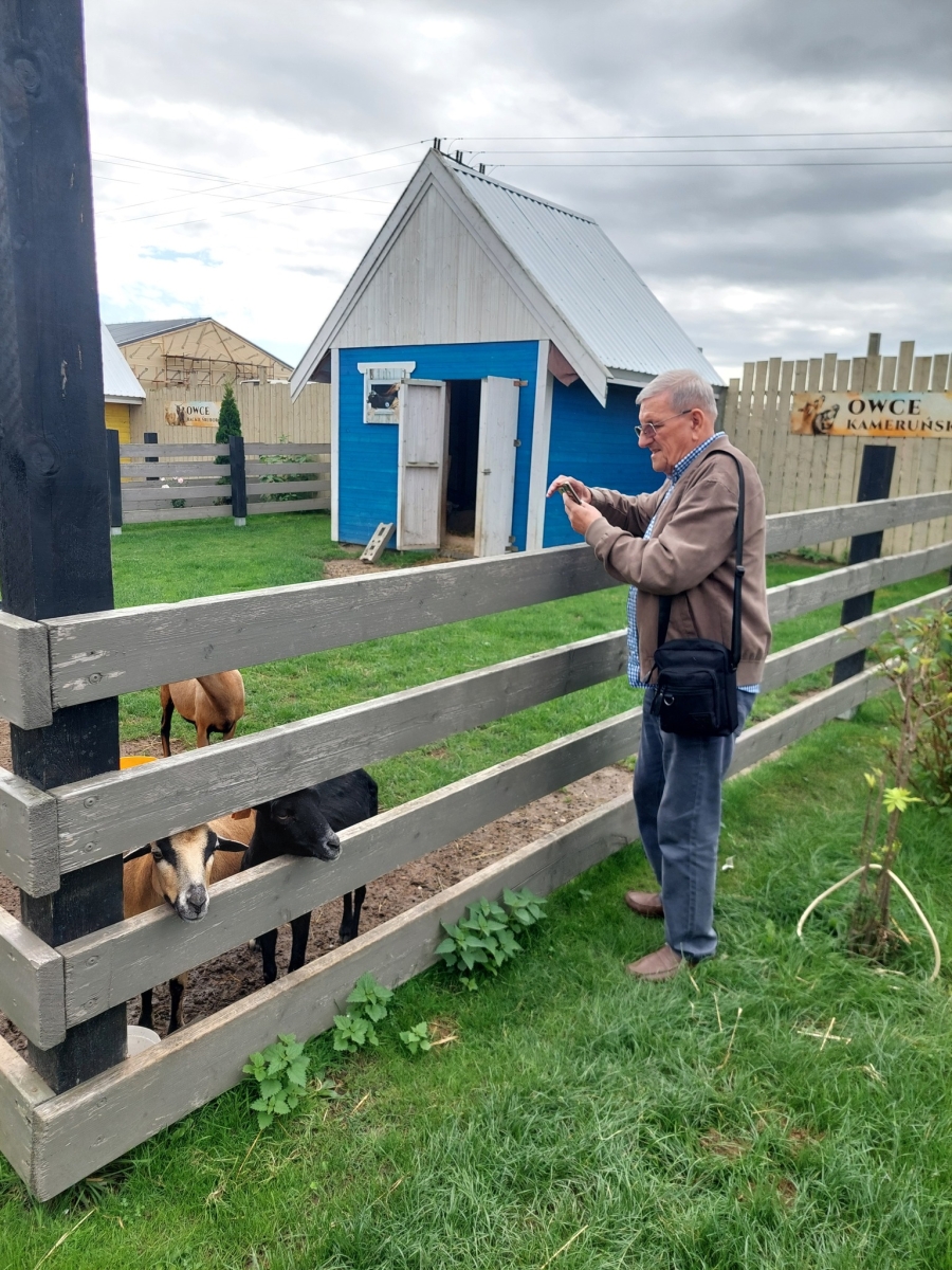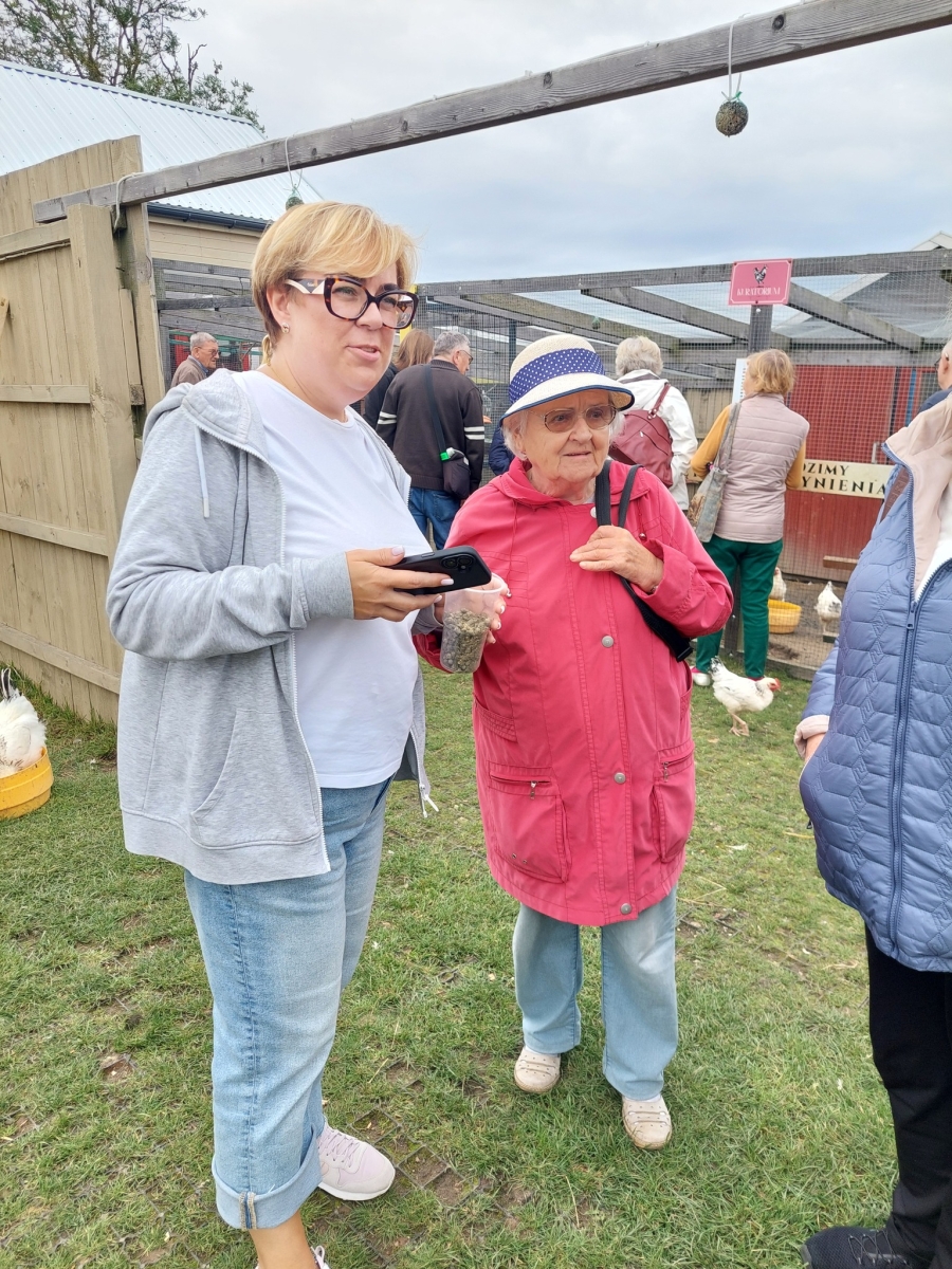 „I rozpoczęliśmy!!! W dniu 12.09.2025 r. seniorzy z Dziennego Domu Złoty Wiek „Senior+” oraz Klubu Różany Zakątek „Senior+” odwiedzili mini z o.o. DonkeySzot Rogozina. Wyjazd został zorganizowany w ramach projektu pt. Podniesienie jakości usług świadczonych przez Dom Pomocy Społecznej „Zielony Taras” w Koszalinie współfinansowanego ze środków ze środków Europejskiego Funduszu Społecznego Plus w ramach Programu Fundusze Europejskie Dla Pomorza Zachodniego 2021-2027 – zadanie 1 Organizacja zajęć i warsztatów dla seniorów. Na miejscu czekało na seniorów wiele atrakcji, w tym warsztaty, na których samodzielnie przygotowali ciasteczka dla zwierząt kopytnych i wysłuchali prelekcji na temat opieki nad zwierzętami, przygotowanych przez osoby prowadzące warsztaty. Seniorzy spróbowali odgadnąć, do których ptaków należą zebrane pióra, sprawdzili, jaka jest różnica pomiędzy runem poszczególnych owiec i z zaciekawieniem przyglądali się wylinkom węży. Seniorów w trakcie warsztatów przywitali pierwsi mieszkańcy DonkeySzot: koty, których jest tu trzynaście, wąż, mopsik oraz urocza koza Milenka, która towarzyszyła seniorom także w trakcie spaceru po zoo. Uczestnicy chętnie przebywali w towarzystwie zwierząt, dotykali, głaskali i karmili. Z dużym zainteresowaniem wysłuchali instrukcji prowadzącej, dotyczących postępowania z wężem, a niektórzy z nich nawet odważyli się wziąć tego pięknego gada w ręce. Po warsztatach seniorzy zwiedzili terrarium i zagrody ze zwierzętami, o których prowadząca ciekawie opowiadała i zachęcała seniorów do karmienia, podając przygotowaną mieszankę. Pogoda również dopisała. To była udana terapia zwierzętami.”