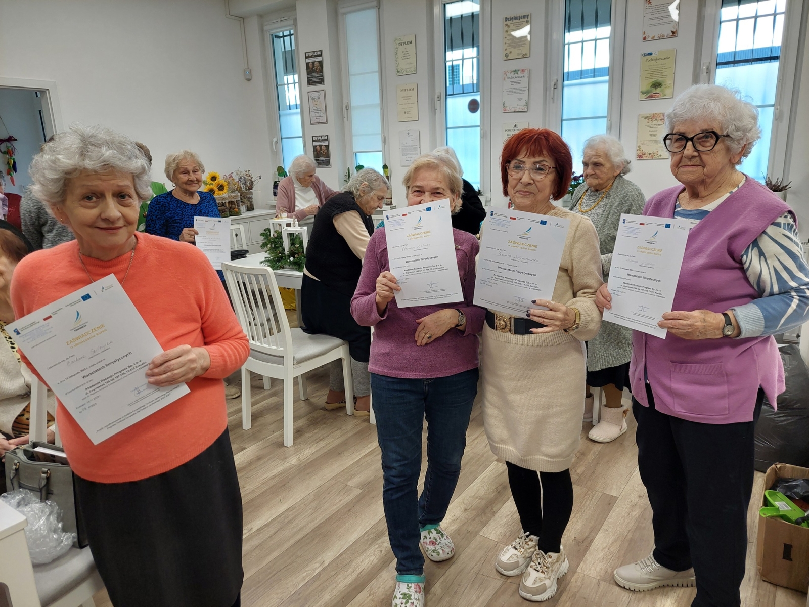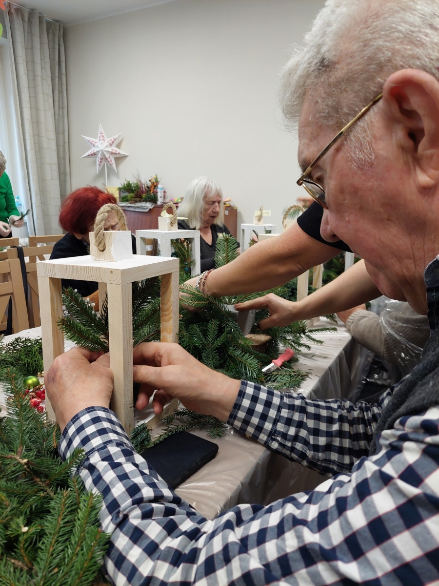 W dniach 13.11.2025-14.11.2025 r. odbyły się warsztaty florystyczne prowadzone przez Akademię Rozwoju PROGRESS Sp. z o.o. z Koszalina. W warsztatach wzięli udział seniorzy z Klubu Różany Zakątek „Senior+” w Koszalinie oraz Dziennego Domu Złoty Wiek „Senior+” w Koszalinie. Pod okiem trenerek uczestnicy wykonali dwie kompozycje: jesienną oraz świąteczną. Każda z wykorzystaniem różnorodnych materiałów. Wymagało to dużo pracy i zaangażowania. Efekt był tego wart.