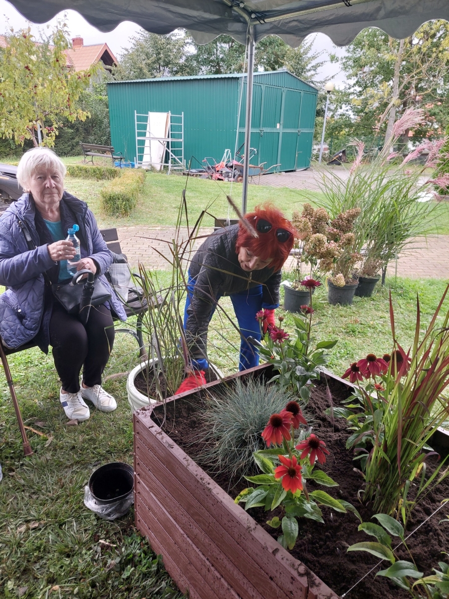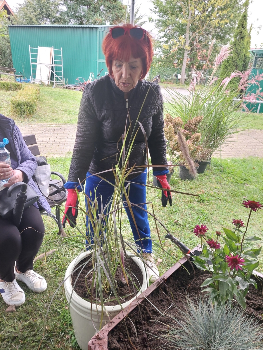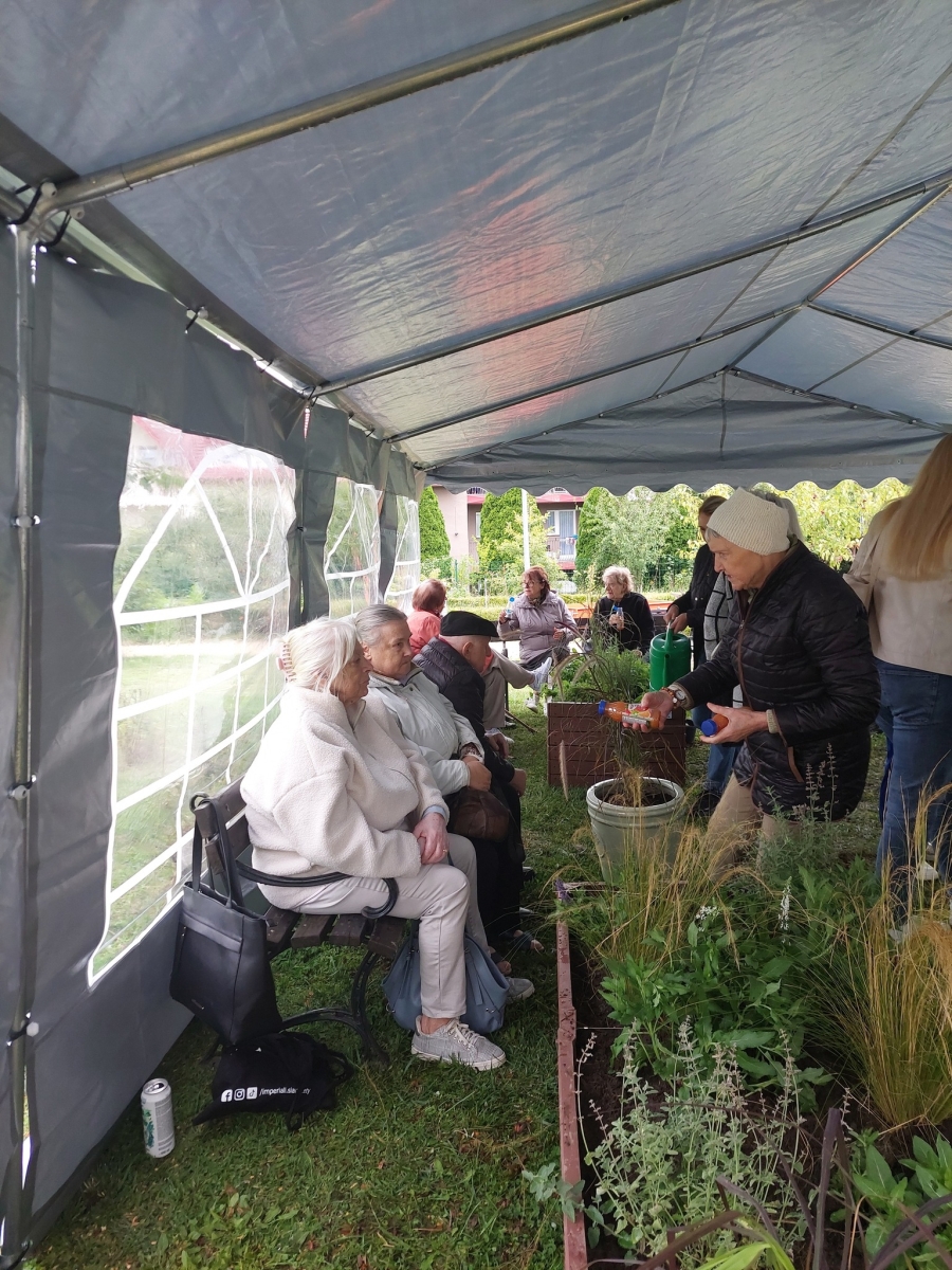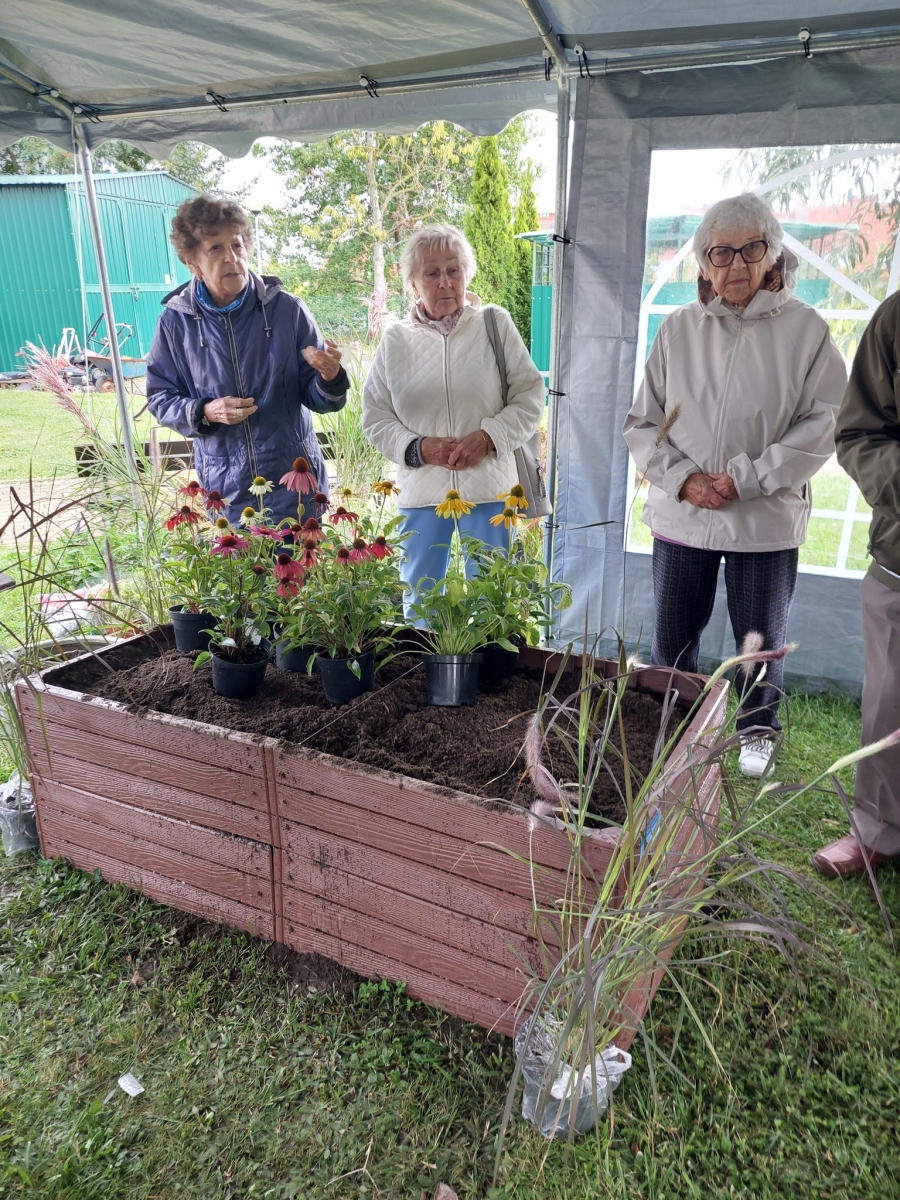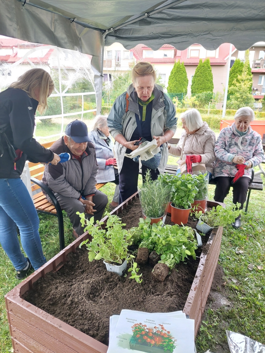 Altana, w której przeprowadzone zostały zajęcia sensoryczne zakupiona została w ramach Zadania 4 Organizacja miejsca wypoczynku i wspólnego spędzania czasu i została wyposażona w elementy sensoryczne, w tym meble ogrodowe, zasłony ogrodowe, lustra ogrodowe, fontanna z zamkniętym obiegiem wody zasilana baterią słoneczną, dzwonki wietrzne oraz rośliny, mające oddziaływać na zmysły osób wypoczywających w altanie: wzroku, słuchu, dotyku, węchu. Realizacja miejsca wypoczynku i wspólnego spędzania czasu ma umożliwić skuteczne przetwarzanie bodźców sensorycznych i przyczynić się do łagodzenia negatywnych konsekwencji w obszarze zdrowia psychicznego spowodowanych podeszłym wiekiem i przewlekłymi chorobami oraz wpłynąć na obniżenie poziomu stresu i frustracji. Podczas zajęć seniorzy relaksowali się przy dźwiękach dzwonków wietrznych, szumie drzew i traw oraz śpiewie ptaków. Mogli także posmakować różnych herbat i spróbować odgadnąć ich smak, a także zapach ziół. Na zakończenie zajęć seniorzy otrzymali upominek w postaci dyfuzora zapachów wraz z olejkiem zapachowym, który będą mogli wykorzystać w domu, ciesząc się pięknym zapachem, dozowanym w formie mgiełki. Natomiast warsztaty ogrodnicze przeprowadzone zostały w ramach zadania numer 1 Rozwój form wsparcia: zajęcia, warsztaty dla uczestników, jako element terapii ogrodem. Warsztaty rozpoczęły się od prelekcji, podczas której prowadząca opowiadała o korzyściach ogrodnictwa dla zdrowia fizycznego. Opowiedziała o bezpiecznym korzystaniu z narzędzi ogrodniczych i organizacja pracy w ogrodzie, dostosowanej do możliwości seniorów, co możemy uprawiać w ogrodzie lub na balkonie. Seniorzy rozpoznawali także popularne rośliny ogrodowe, usłyszeli wiele informacji na temat podlewania, nawożenia i przycinania roślin, pielęgnacja bez wysiłku – jak dbać o ogród bez przeciążania się, ekologicznym ogrodnictwie domowym i wspieraniu pszczół i motyli. Następnie wspólne przygotowali rabaty wyniesione, w których posadzili rośliny ozdobne i użytkowe. Na zakończenie warsztatów otrzymali zaświadczenia oraz upominek w postaci zestawu narzędzi ogrodniczych.