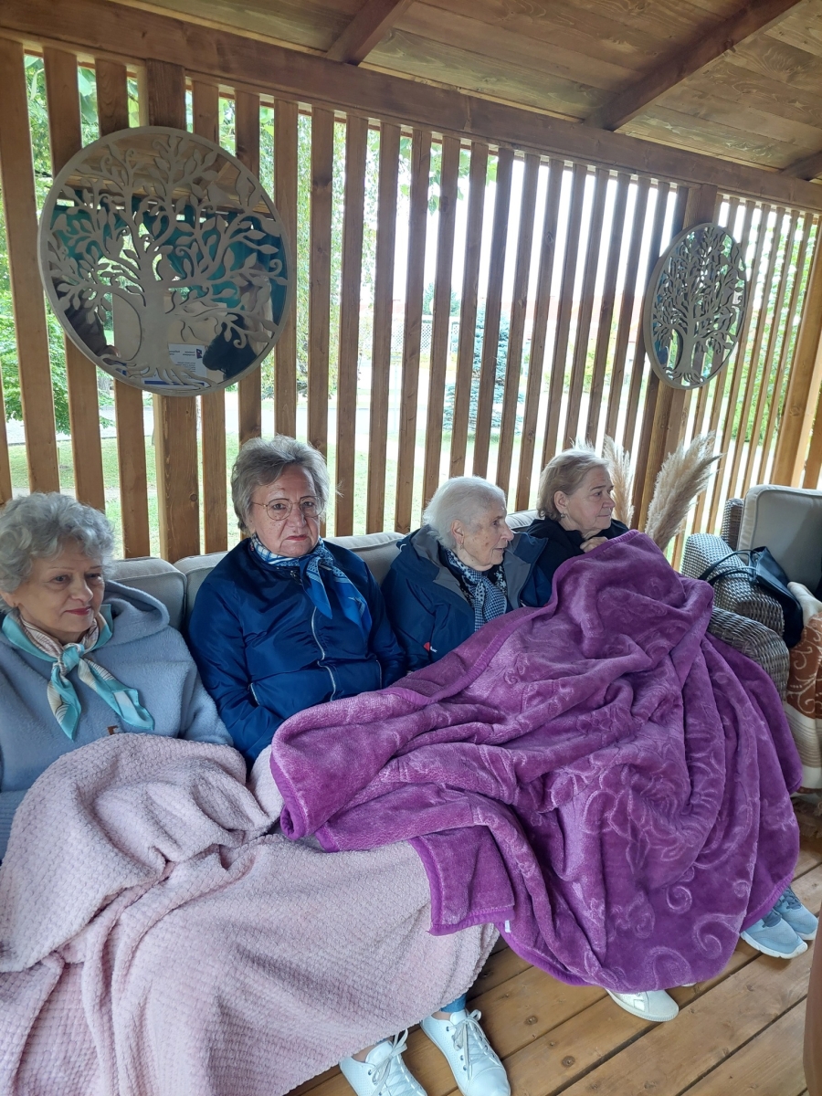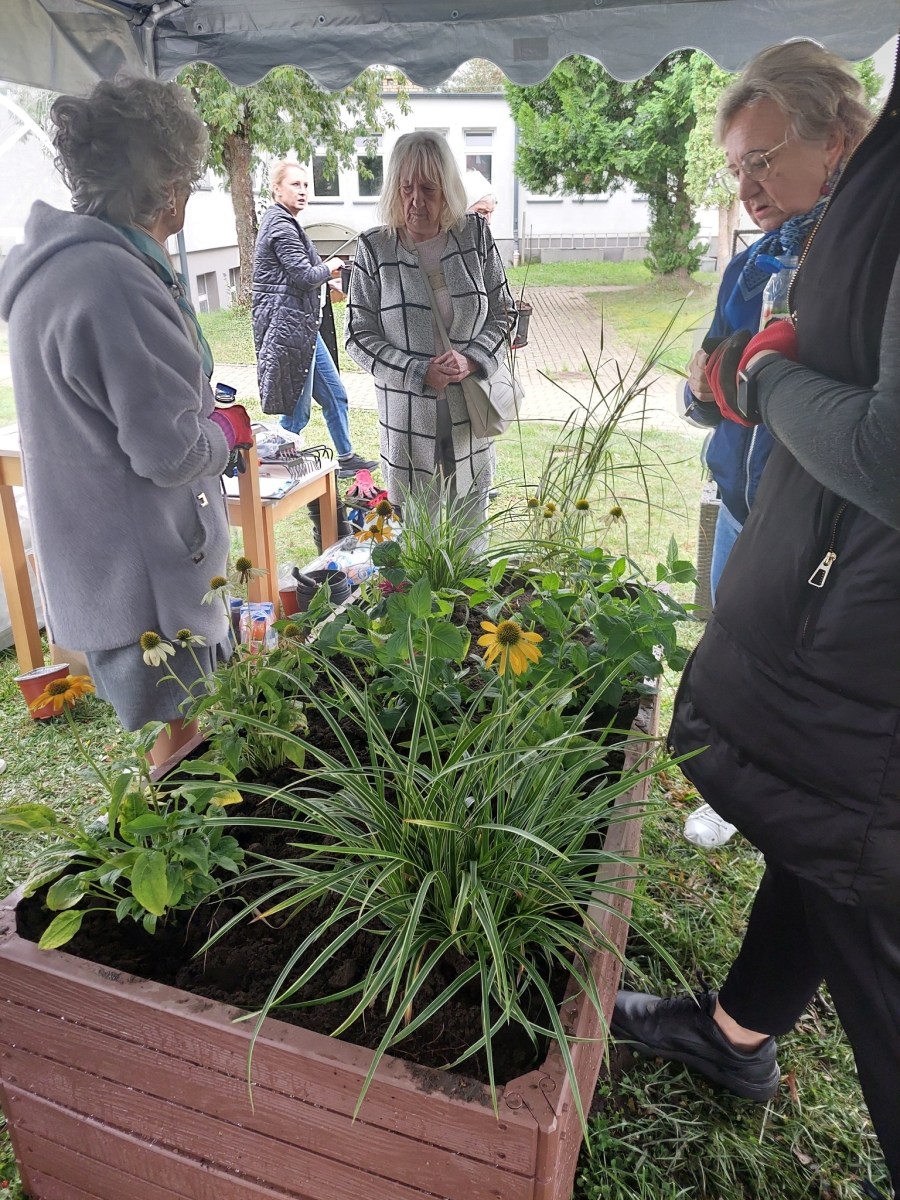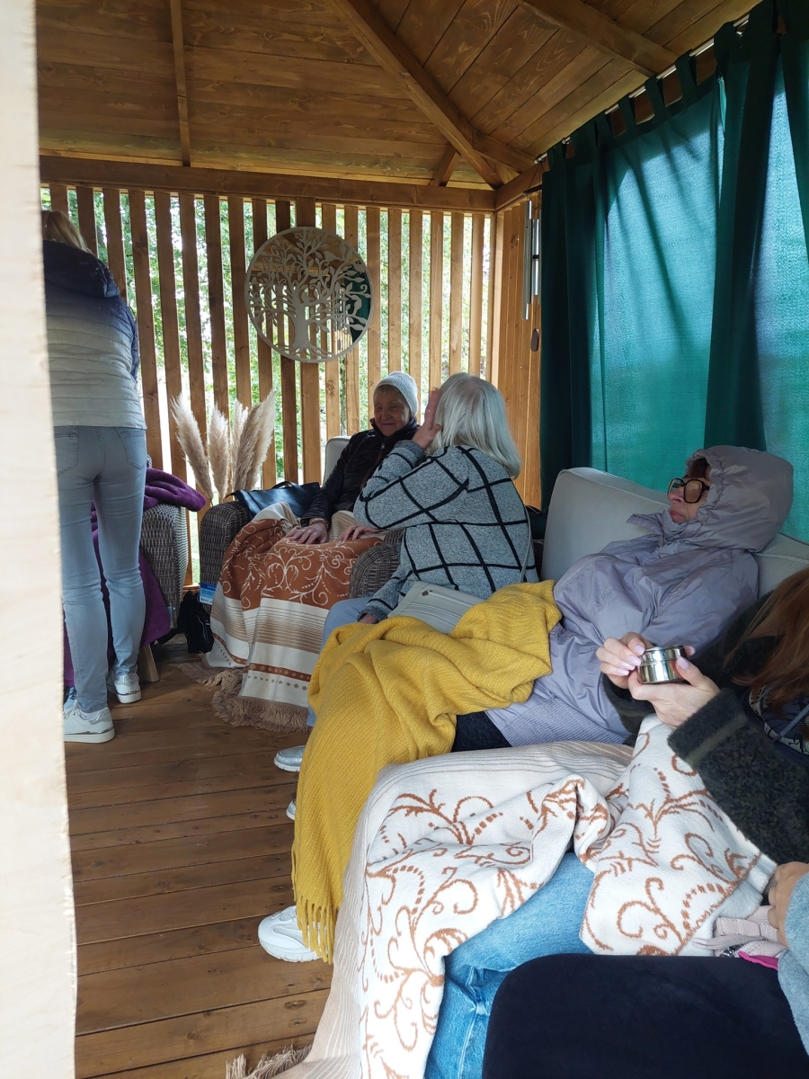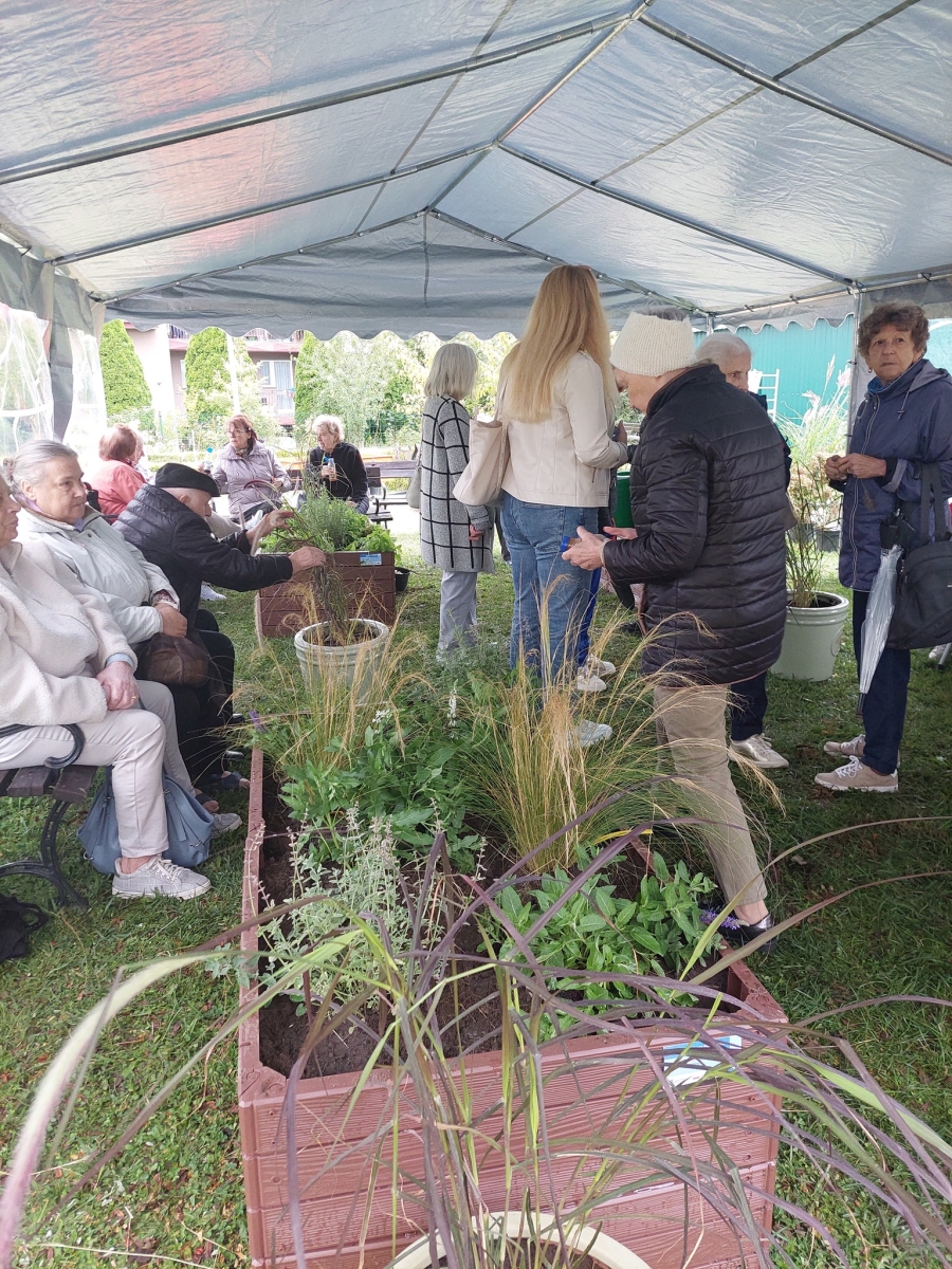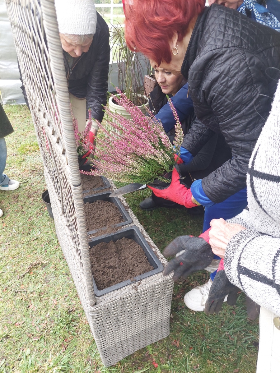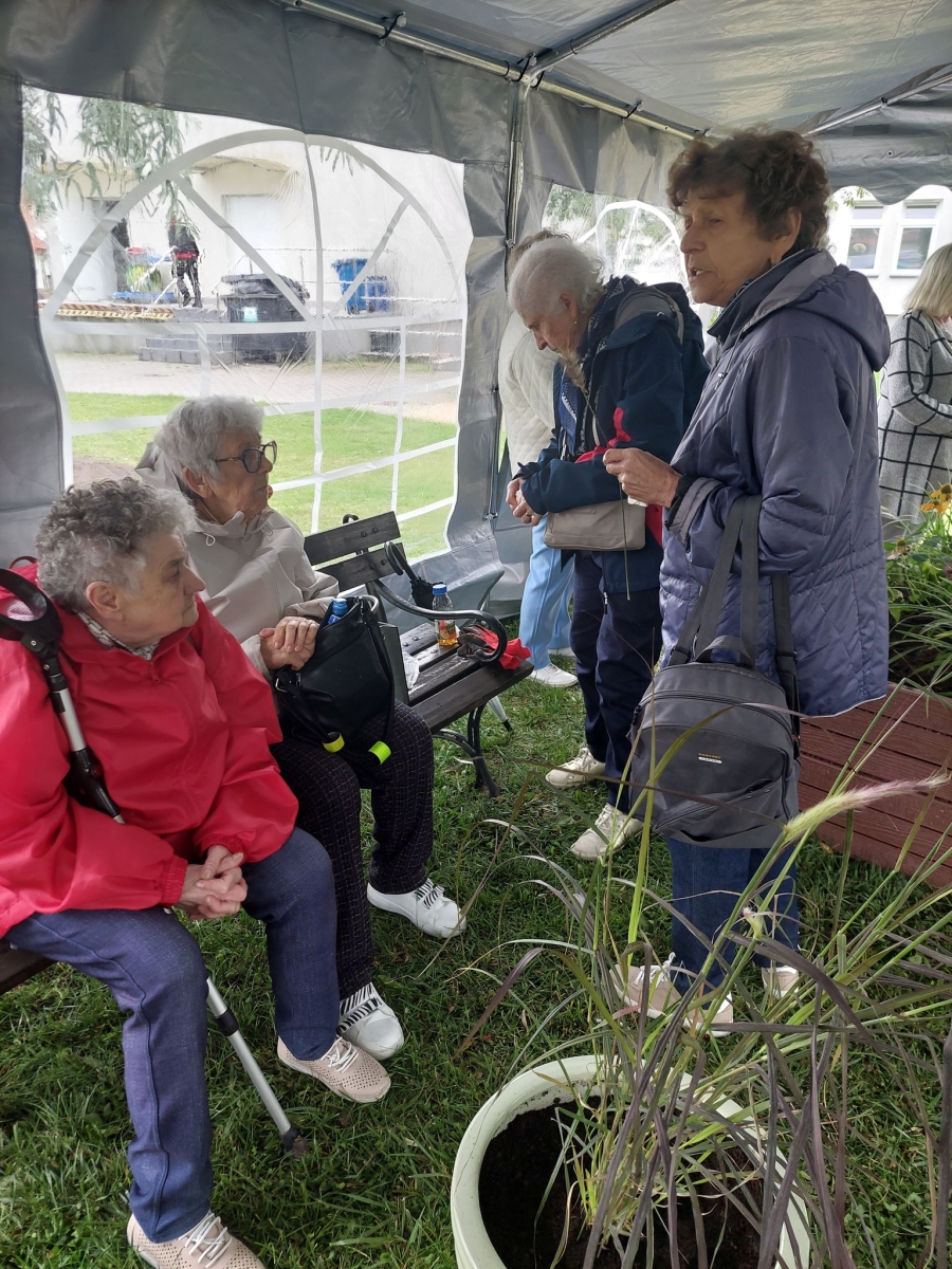 Altana, w której przeprowadzone zostały zajęcia sensoryczne zakupiona została w ramach Zadania 4 Organizacja miejsca wypoczynku i wspólnego spędzania czasu i została wyposażona w elementy sensoryczne, w tym meble ogrodowe, zasłony ogrodowe, lustra ogrodowe, fontanna z zamkniętym obiegiem wody zasilana baterią słoneczną, dzwonki wietrzne oraz rośliny, mające oddziaływać na zmysły osób wypoczywających w altanie: wzroku, słuchu, dotyku, węchu. Realizacja miejsca wypoczynku i wspólnego spędzania czasu ma umożliwić skuteczne przetwarzanie bodźców sensorycznych i przyczynić się do łagodzenia negatywnych konsekwencji w obszarze zdrowia psychicznego spowodowanych podeszłym wiekiem i przewlekłymi chorobami oraz wpłynąć na obniżenie poziomu stresu i frustracji. Podczas zajęć seniorzy relaksowali się przy dźwiękach dzwonków wietrznych, szumie drzew i traw oraz śpiewie ptaków. Mogli także posmakować różnych herbat i spróbować odgadnąć ich smak, a także zapach ziół. Na zakończenie zajęć seniorzy otrzymali upominek w postaci dyfuzora zapachów wraz z olejkiem zapachowym, który będą mogli wykorzystać w domu, ciesząc się pięknym zapachem, dozowanym w formie mgiełki. Natomiast warsztaty ogrodnicze przeprowadzone zostały w ramach zadania numer 1 Rozwój form wsparcia: zajęcia, warsztaty dla uczestników, jako element terapii ogrodem. Warsztaty rozpoczęły się od prelekcji, podczas której prowadząca opowiadała o korzyściach ogrodnictwa dla zdrowia fizycznego. Opowiedziała o bezpiecznym korzystaniu z narzędzi ogrodniczych i organizacja pracy w ogrodzie, dostosowanej do możliwości seniorów, co możemy uprawiać w ogrodzie lub na balkonie. Seniorzy rozpoznawali także popularne rośliny ogrodowe, usłyszeli wiele informacji na temat podlewania, nawożenia i przycinania roślin, pielęgnacja bez wysiłku – jak dbać o ogród bez przeciążania się, ekologicznym ogrodnictwie domowym i wspieraniu pszczół i motyli. Następnie wspólne przygotowali rabaty wyniesione, w których posadzili rośliny ozdobne i użytkowe. Na zakończenie warsztatów otrzymali zaświadczenia oraz upominek w postaci zestawu narzędzi ogrodniczych.