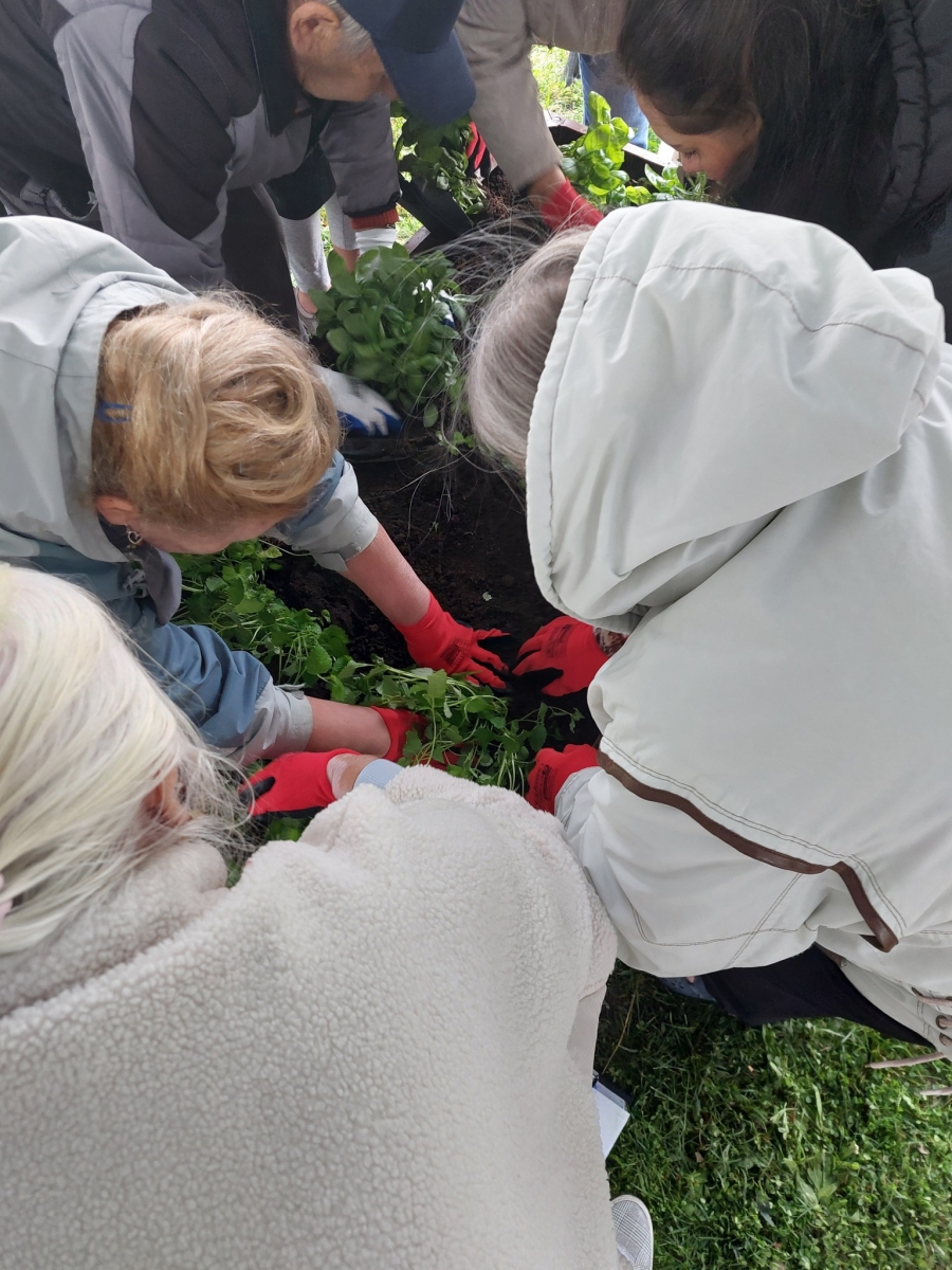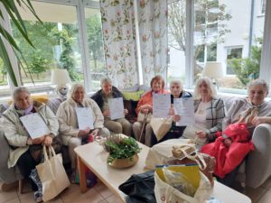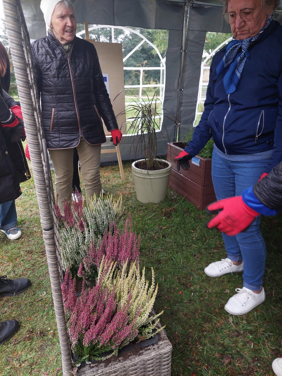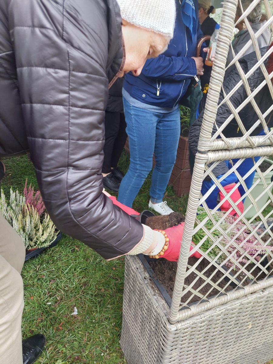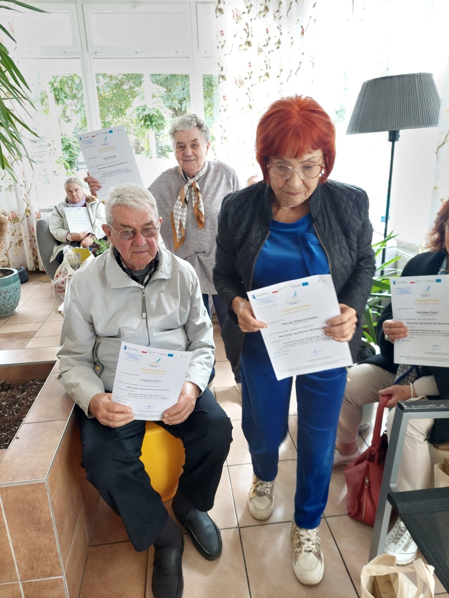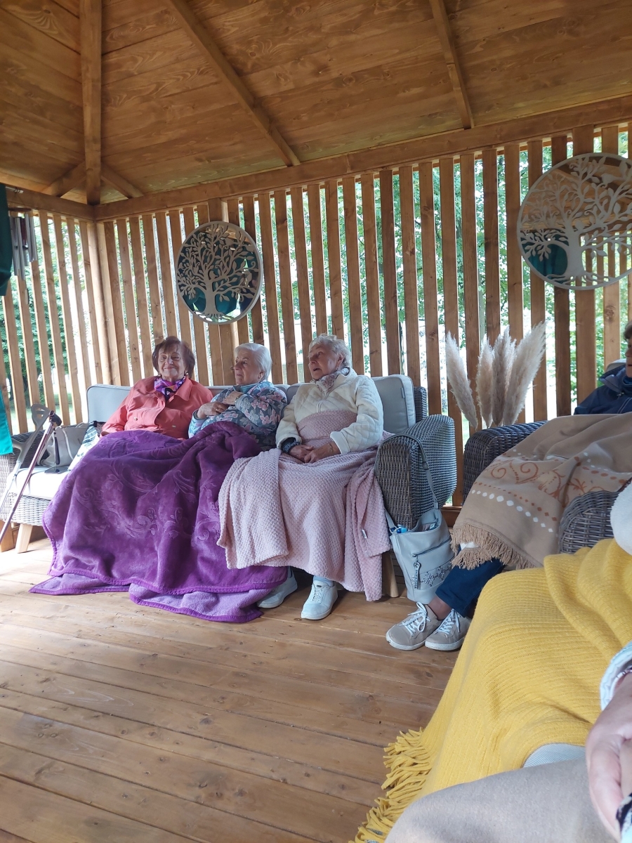 Altana, w której przeprowadzone zostały zajęcia sensoryczne zakupiona została w ramach Zadania 4 Organizacja miejsca wypoczynku i wspólnego spędzania czasu i została wyposażona w elementy sensoryczne, w tym meble ogrodowe, zasłony ogrodowe, lustra ogrodowe, fontanna z zamkniętym obiegiem wody zasilana baterią słoneczną, dzwonki wietrzne oraz rośliny, mające oddziaływać na zmysły osób wypoczywających w altanie: wzroku, słuchu, dotyku, węchu. Realizacja miejsca wypoczynku i wspólnego spędzania czasu ma umożliwić skuteczne przetwarzanie bodźców sensorycznych i przyczynić się do łagodzenia negatywnych konsekwencji w obszarze zdrowia psychicznego spowodowanych podeszłym wiekiem i przewlekłymi chorobami oraz wpłynąć na obniżenie poziomu stresu i frustracji. Podczas zajęć seniorzy relaksowali się przy dźwiękach dzwonków wietrznych, szumie drzew i traw oraz śpiewie ptaków. Mogli także posmakować różnych herbat i spróbować odgadnąć ich smak, a także zapach ziół. Na zakończenie zajęć seniorzy otrzymali upominek w postaci dyfuzora zapachów wraz z olejkiem zapachowym, który będą mogli wykorzystać w domu, ciesząc się pięknym zapachem, dozowanym w formie mgiełki. Natomiast warsztaty ogrodnicze przeprowadzone zostały w ramach zadania numer 1 Rozwój form wsparcia: zajęcia, warsztaty dla uczestników, jako element terapii ogrodem. Warsztaty rozpoczęły się od prelekcji, podczas której prowadząca opowiadała o korzyściach ogrodnictwa dla zdrowia fizycznego. Opowiedziała o bezpiecznym korzystaniu z narzędzi ogrodniczych i organizacja pracy w ogrodzie, dostosowanej do możliwości seniorów, co możemy uprawiać w ogrodzie lub na balkonie. Seniorzy rozpoznawali także popularne rośliny ogrodowe, usłyszeli wiele informacji na temat podlewania, nawożenia i przycinania roślin, pielęgnacja bez wysiłku – jak dbać o ogród bez przeciążania się, ekologicznym ogrodnictwie domowym i wspieraniu pszczół i motyli. Następnie wspólne przygotowali rabaty wyniesione, w których posadzili rośliny ozdobne i użytkowe. Na zakończenie warsztatów otrzymali zaświadczenia oraz upominek w postaci zestawu narzędzi ogrodniczych.