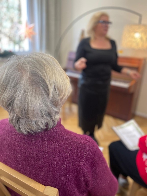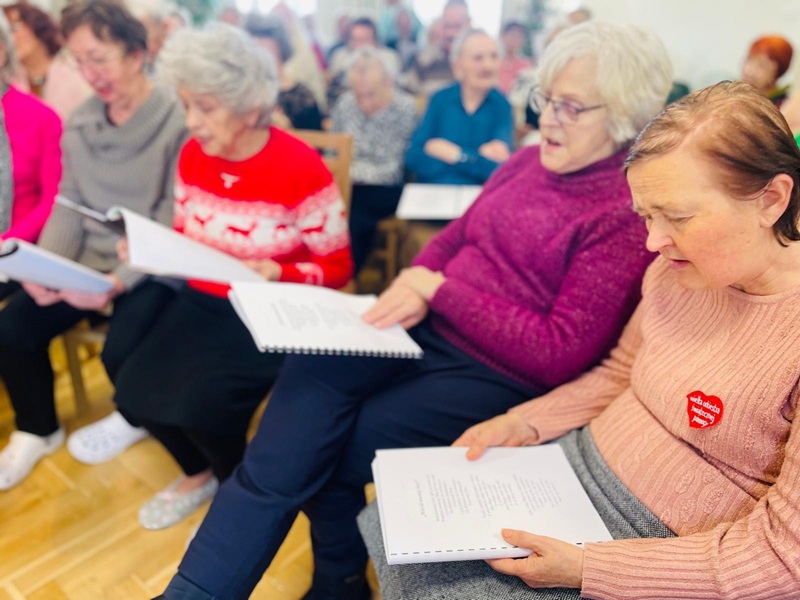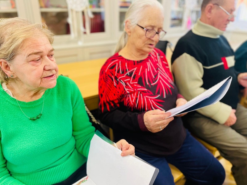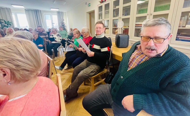 Zanim rozpoczęło się wspólne śpiewanie kolęd, uczestnicy wzięli udział w ćwiczeniach dykcyjnych i zabawowych. Pomogły one rozluźnić mięśnie, poprawić emisję głosu oraz wprowadzić wszystkich w radosny nastrój. Następnie, przy akompaniamencie pianina, seniorzy z entuzjazmem wykonywali znane i lubiane kolędy.